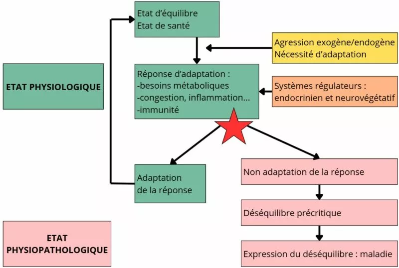 Soit la régulation neuroendocrinienne n’est pas satisfaisante dans la réponse dynamique adaptative et ne permet pas de fournir les éléments métabolique nécessaires quantitativement, qualitativement et/ou chronologiquement, et/ou ne permet pas un retour à l’état d’équilibre premier. Cette non-adaptation de la réponse physiologique fera alors basculer l’organisme dans un état physiopathologique avec la mise en place d’un état précritique, faisant le lit de la maladie. La maladie n’est alors que le bout de la chaîne exprimant ce déséquilibre inducteur. De ce fait, le véritable traitement étiologique, répondant à une réflexion physiologique intégrative et endobiogénique, se situera au point de bascule névralgique qui permettra à l’organisme de rester dans une réponse physiologique adaptative ou de basculer dans la physiopathologie et à terme dans la maladie.